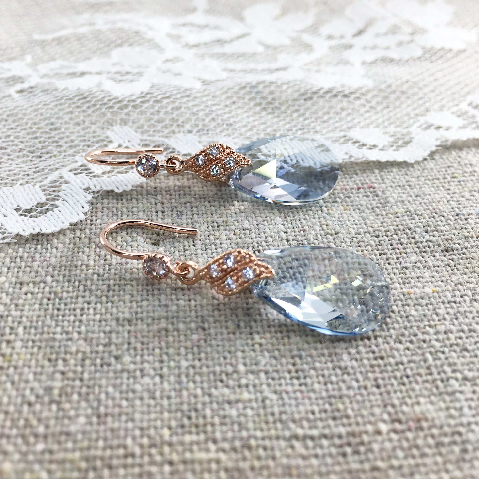 Simply gorgeous dangling earrings made with your big day in mind made with teardrop Swarovski® crystals and cubic zirconia pavé details. The Tina necklace is sold separately to make the perfect set. The set shown is in rose gold with the French blue color crystal
