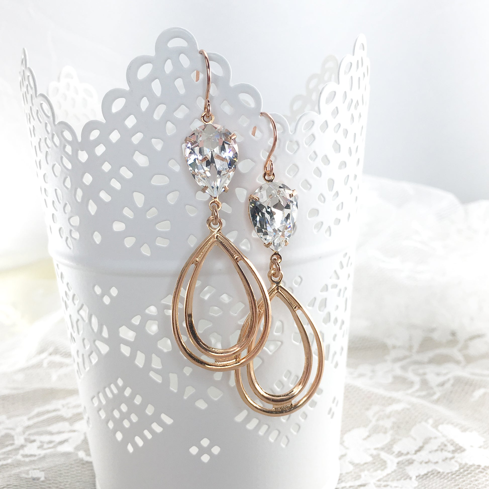 These earrings are really lightweight and so fun to wear. The inverted crystal pear on top and the hollow double pear hoops beneath make for a unique aesthetic.