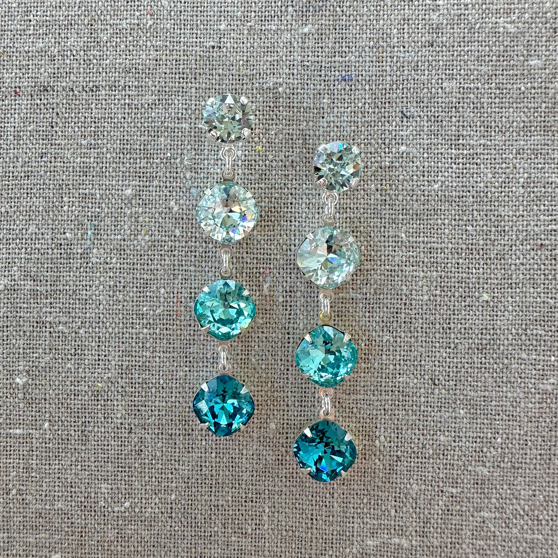 Gorgeous long dangling post earrings in turquoise ombre featuring light azore, light turquoise and indicolite