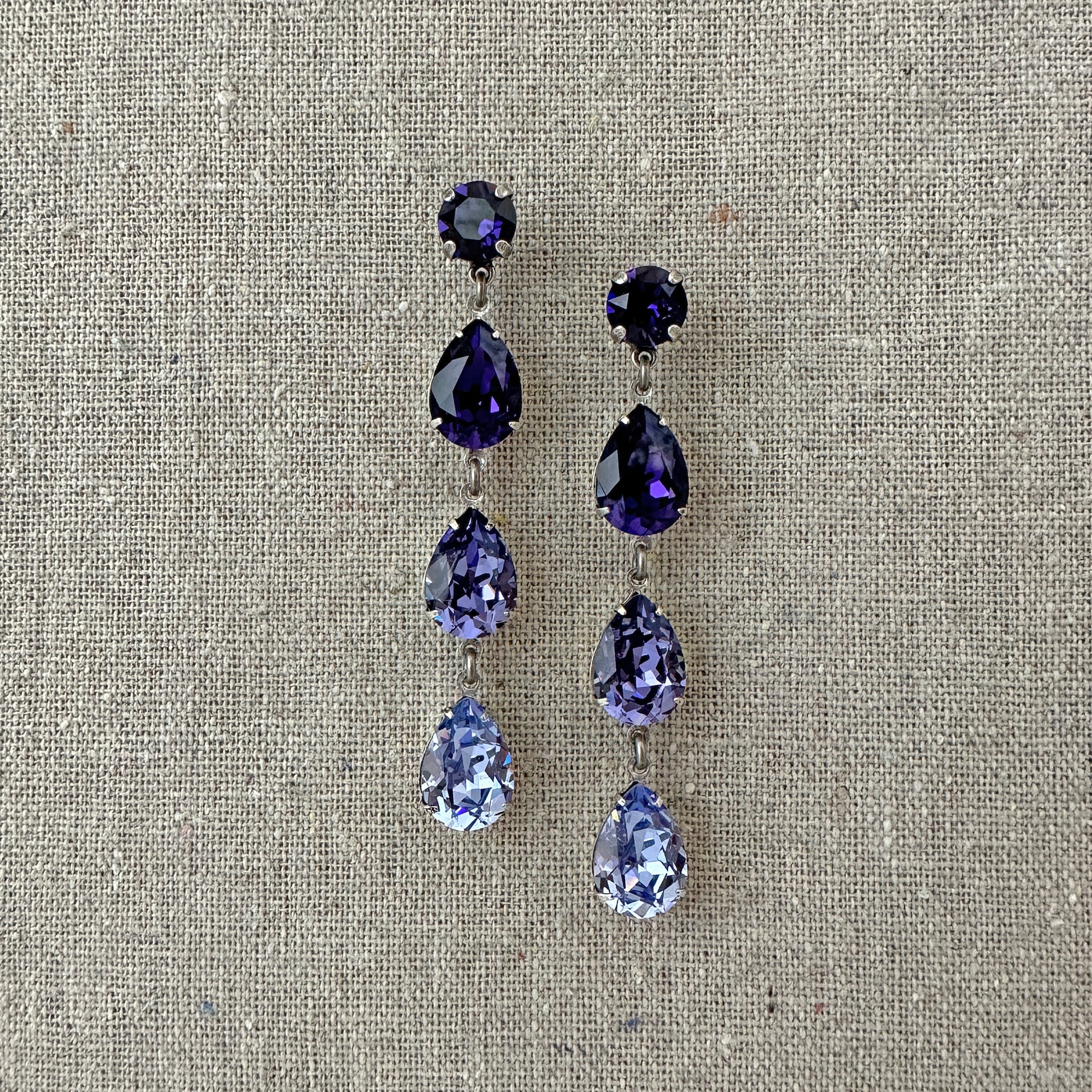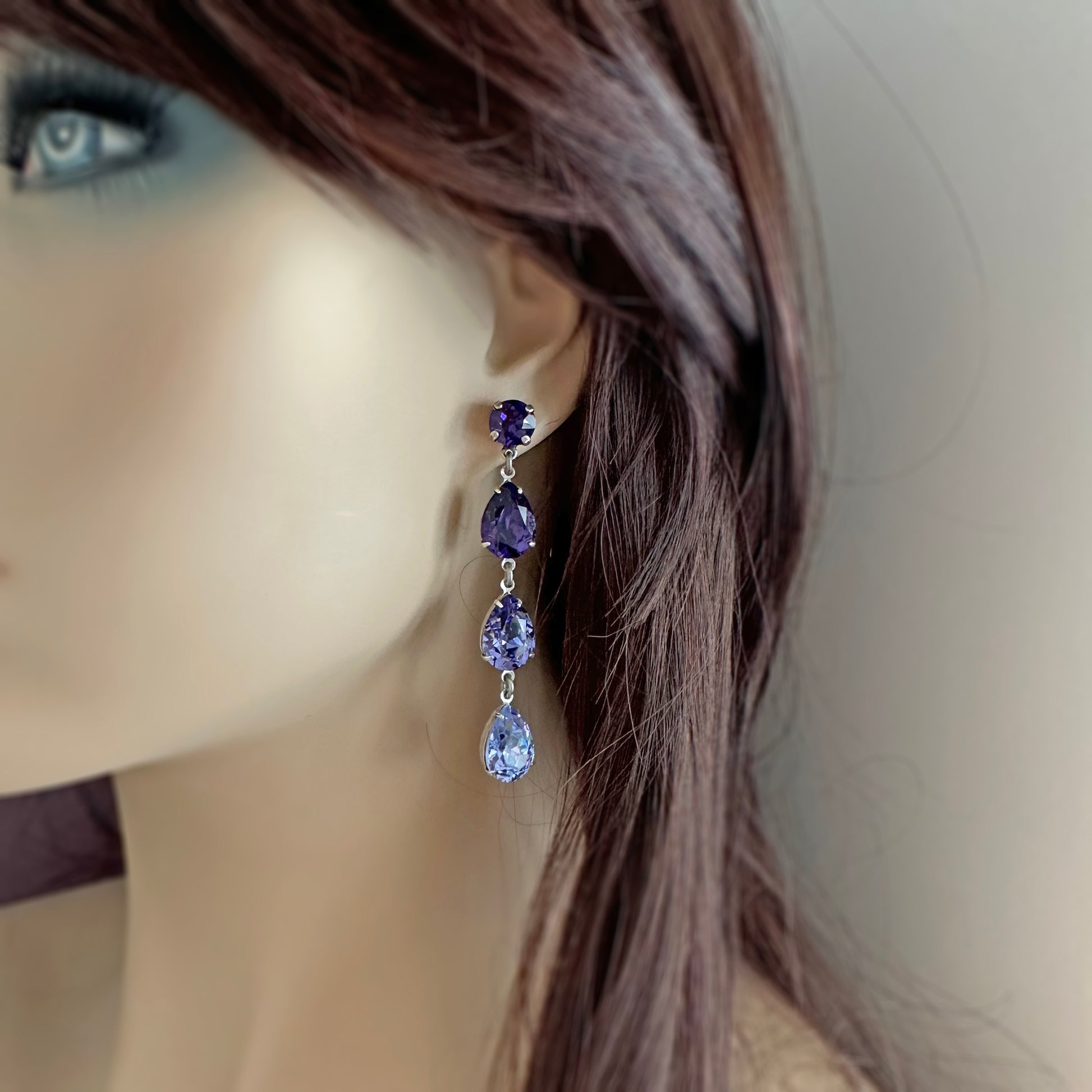 Gorgeous long dangling post earrings in purple ombre featuring purple velvet, tanzanite and Provence lavender pear cut Swarovski® crystals.