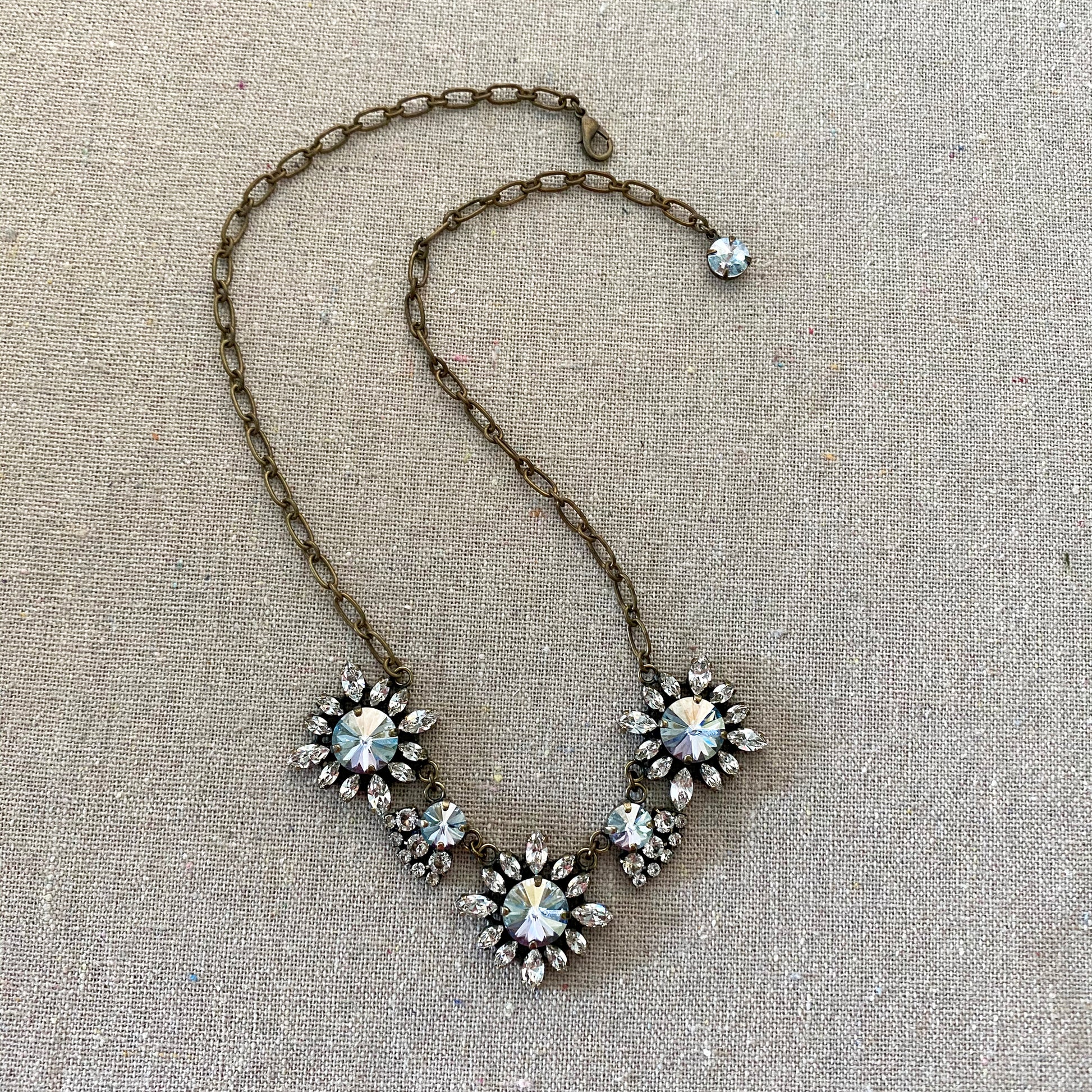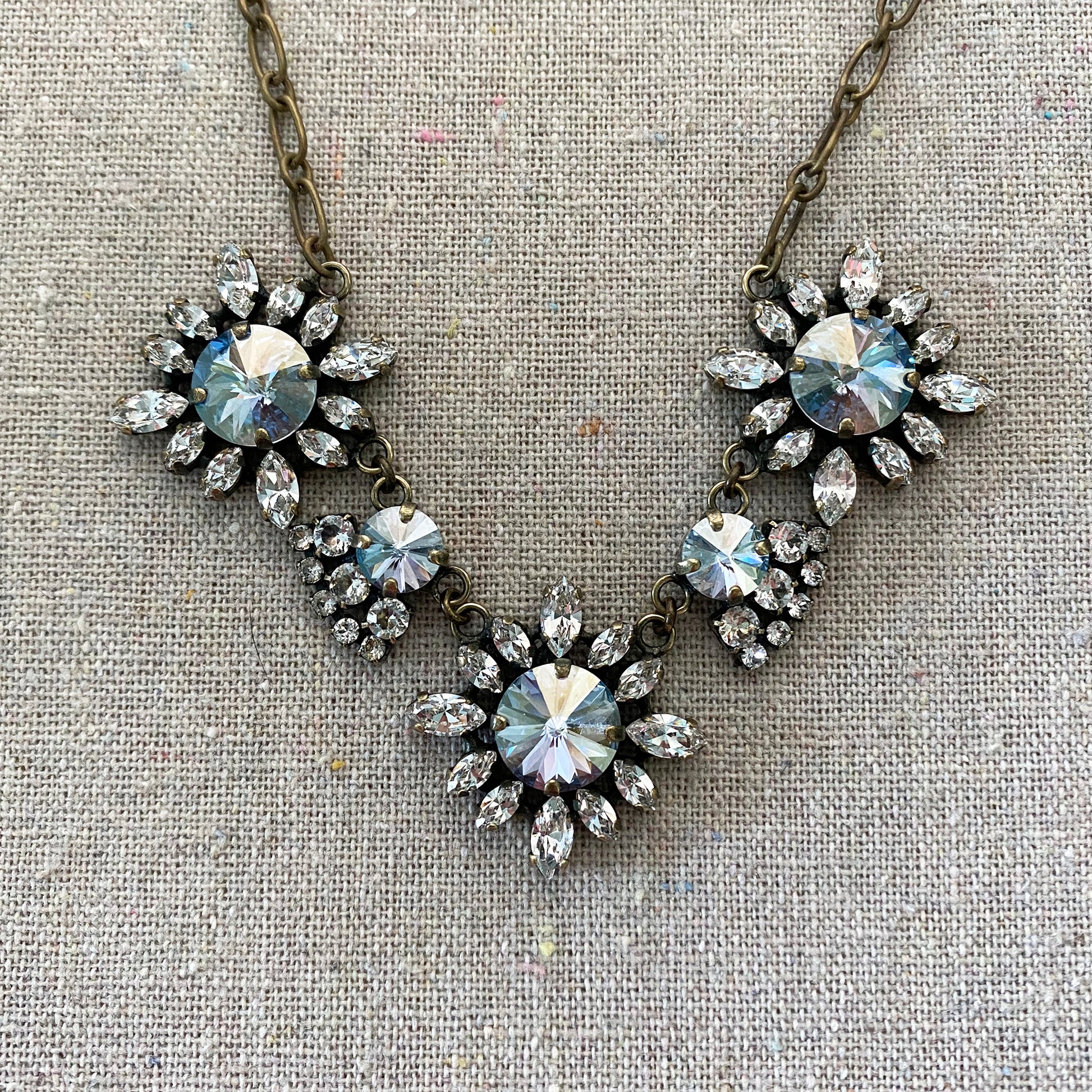 Make a statement with this vintage inspired adjustable collar necklace. Featuring various sizes of crystals in crystal and dusty French blue set in aged brass. The alternating oval to round chain links make it adjustable and can be worn up to 18". Shown being worn at 14" length.