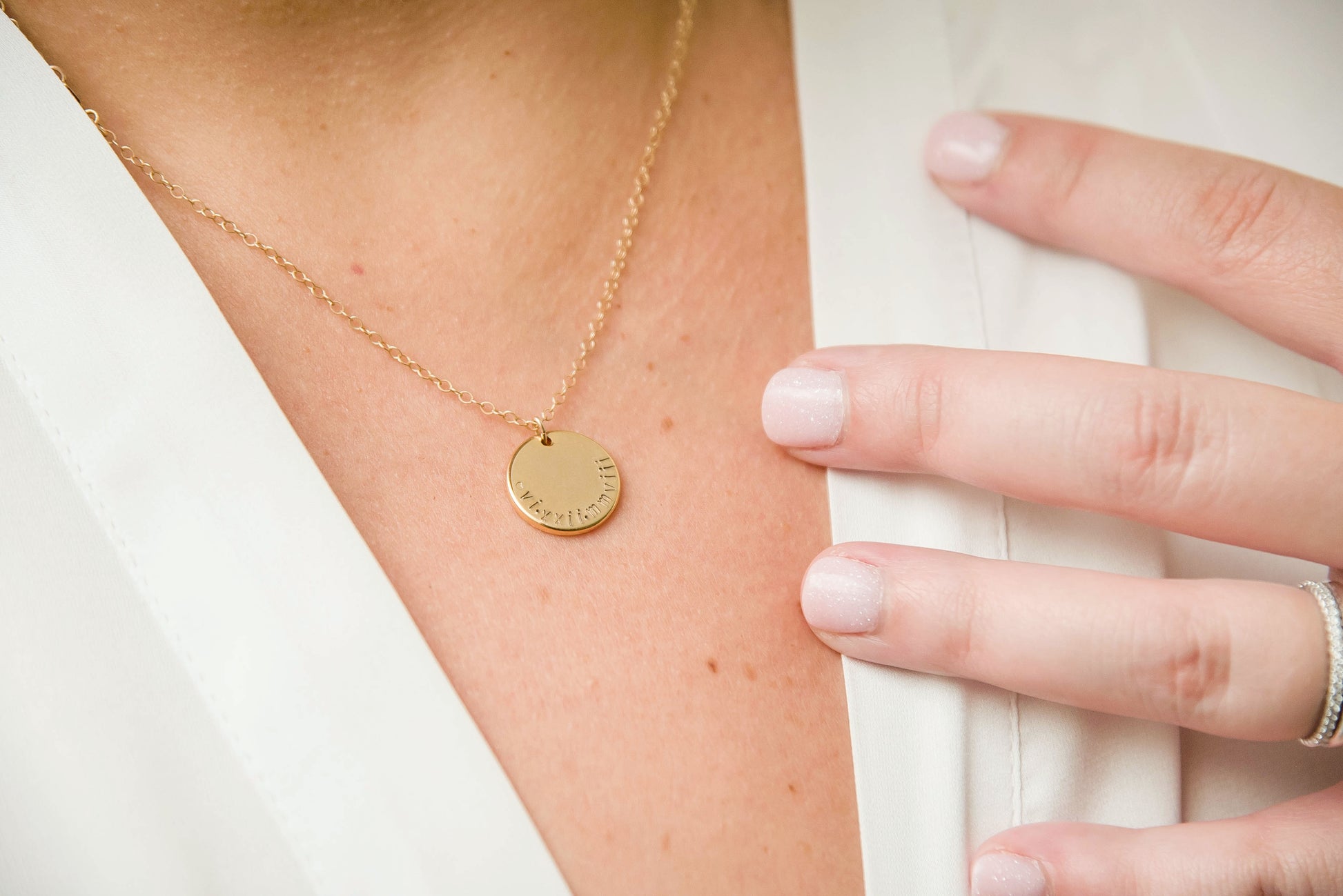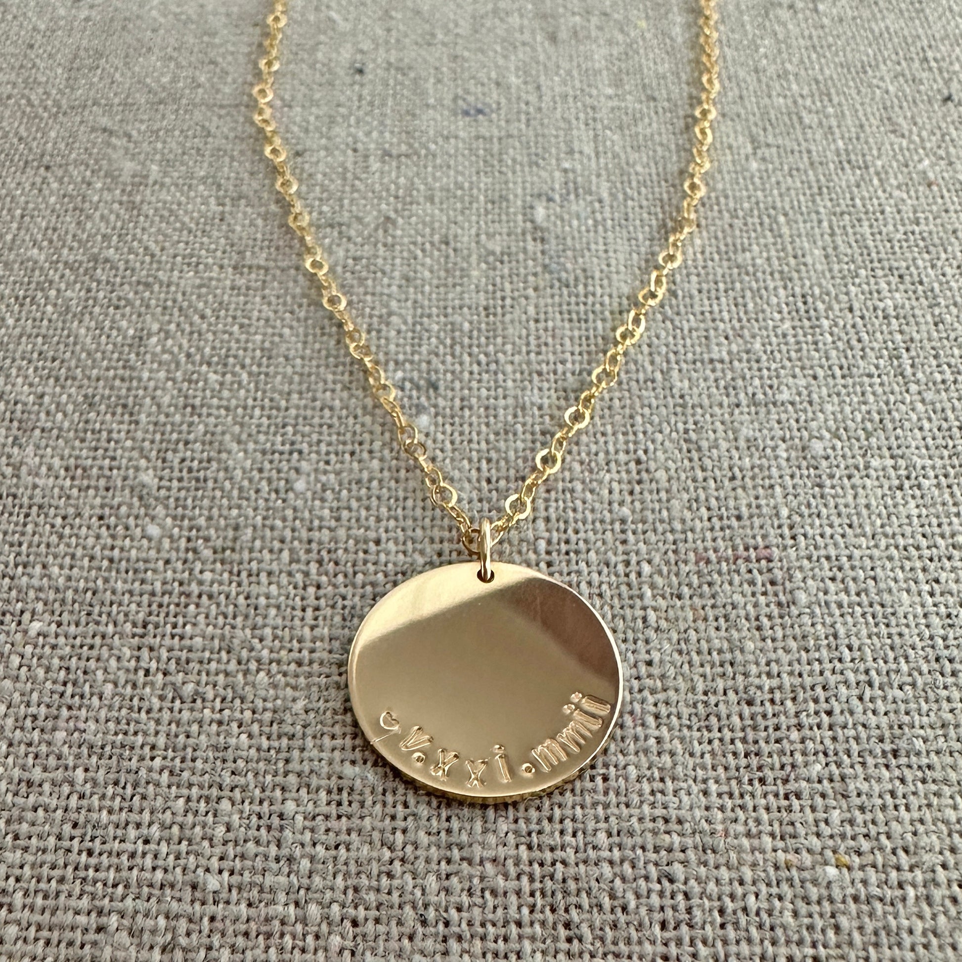 Simple doesn't always mean boring, like in this small coin necklace. Whether you're wearing it solo or pairing it with a few others for a layered look, this necklace will be your favorite daily accessory. A small disc with your special date is hand-stamped to make it perfectly personalized.